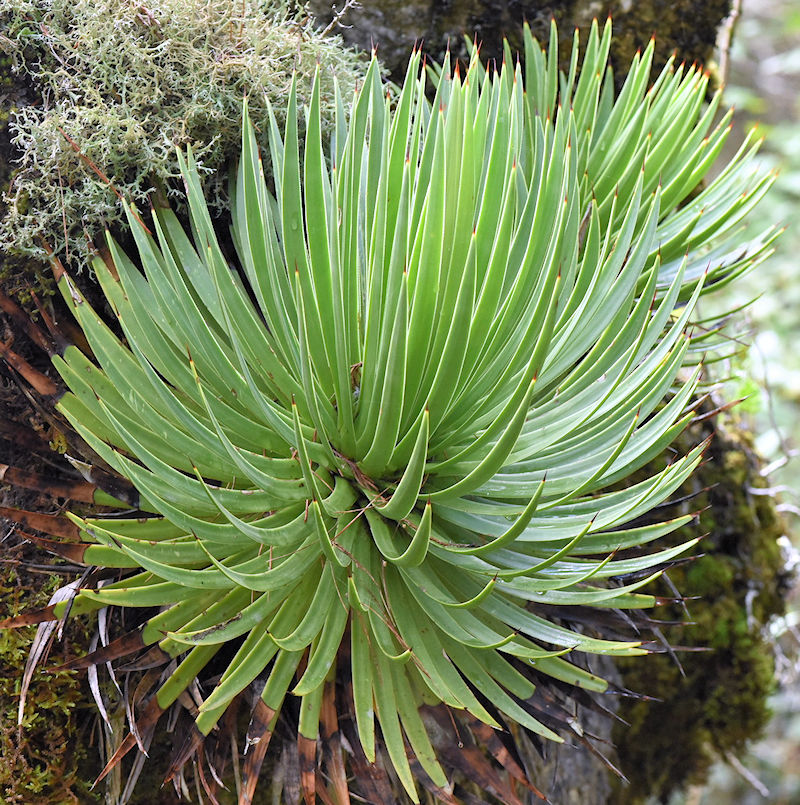 L’inflorescence, lorsque la rosette a atteint la maturité, est assez semblable : un mât d’environ 2 m, hérissé de petites fleurs en tube verts d’où ressortent les étamines pourpres comme des moustaches de chat. Sauf que Minou ne risque pas de grimper dessus, vu la finesse de la tige florale : à peine 5 cm de diamètre.