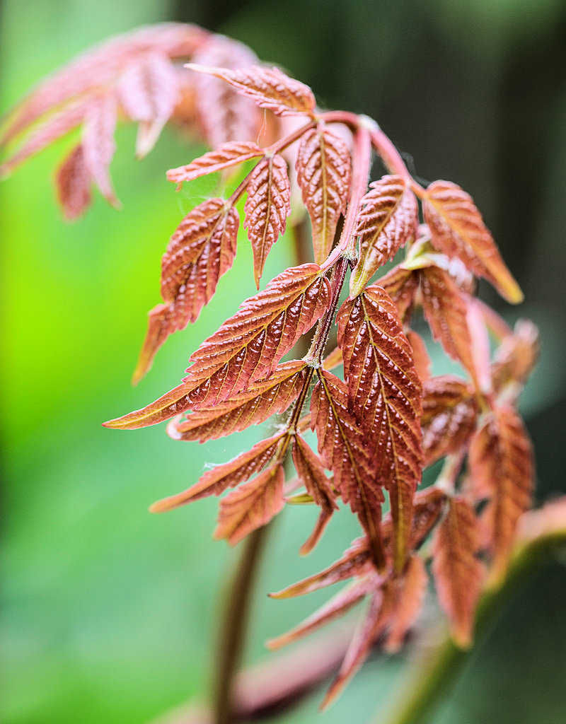 Cette grimpante fait partie de ces grimpantes au look un peu à part, presque préhistorique d’allure, avec ses feuilles immenses, qui peuvent atteindre 70 cm de long dans des conditions de fertilité optimale. Les feuilles sont composées, divisées deux fois. Les folioles, qui sont dentées, ajoutent à cette effet de feuille complexe. La composition des feuilles est variable : très divisées en début de croissance, les nouvelles feuilles se déployant ont tendance à se simplifier au fur et à mesure que la saison avance. Les premières feuilles sont joliment colorées de cuivre, avant de prendre une teinte vert vif, puis vert mat.