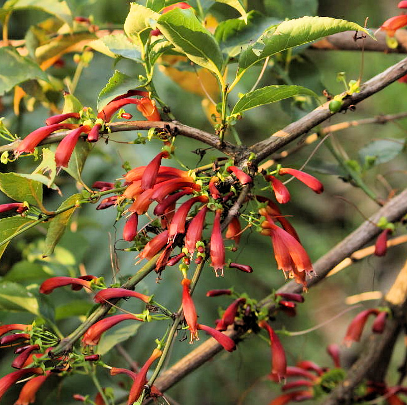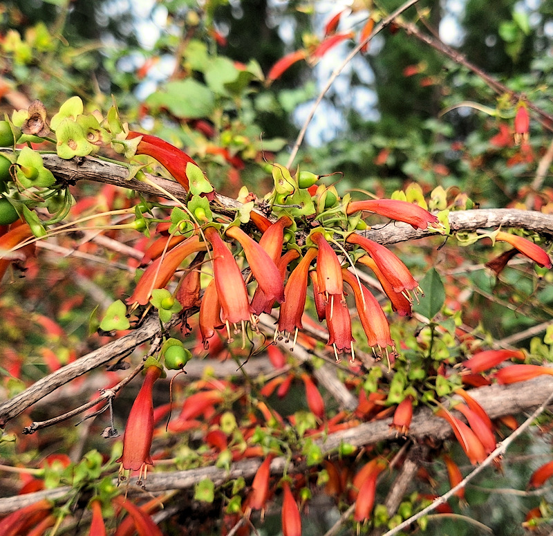 Halleria lucida est le chèvrefeuille africain. Oubliez l’image que vous avez du chèvrefeuille car cette plante, magnifique, n’a pas grand-chose à voir avec les vrais chèvrefeuilles.