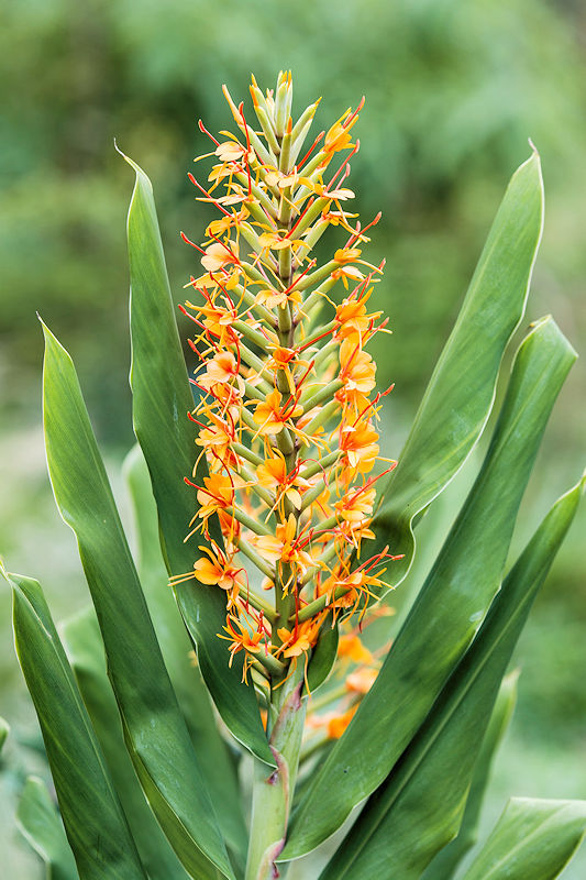 À compter de la mi-mai (selon les régions), l’Hedychium ‘Tara’ forme des tiges sortant de terre et portant un beau feuillage bleuté. C‘est l’une des plus mates de toutes les variétés d’hédychium et lorsque ‘Tara’ se mélange aux autres, on ne peut pas le confondre. Ses tiges peuvent atteindre facilement 2 m en sol bien arrosé. En terre sablonneuse, il reste à 1,50 m, ce qui n’est pas déshonorant. Les tiges sont surmontées d’épis de fleurs orange, sans parfum (contrairement à ce qu’on lit ailleurs…), mais bien colorées. Les fleurs de l’hédychium Tara sont d’un orange chaud.