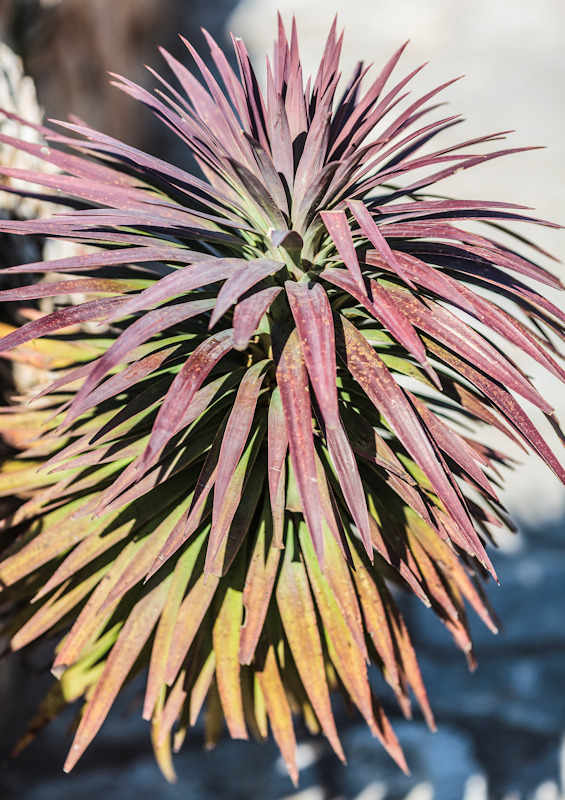 Oubliez les géants verts avec ce yucca. En effet, Yucca desmetiana est petit et pourpre. Du moins, à la pleine lumière. Les Américains l’appellent Blue Boy, ce yucca. C’est vrai que lorsqu’il est jeune et gardé à la lumière diffuse, ce yucca est bleuté. C’est l’été, en rôtissant au soleil qu’in prend cette teinte caractéristique : on ne peut confondre Yucca desmetiana avec aucun autre yucca.